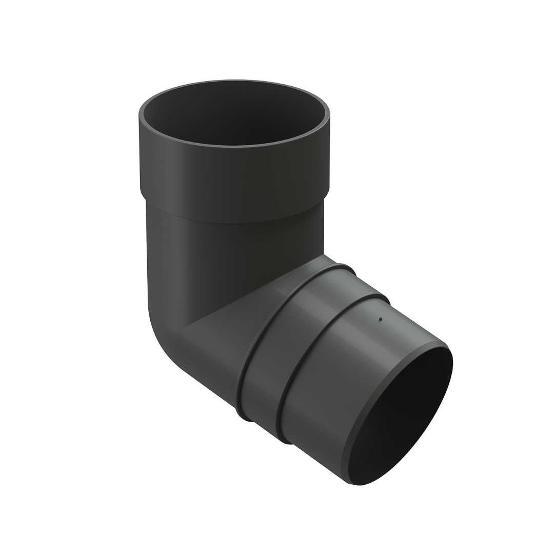 Система колен 72 градуса, окрашенная в цвет «Графит» необходима, чтобы связать воронку желоба и трубу, огибая выступы кровли.