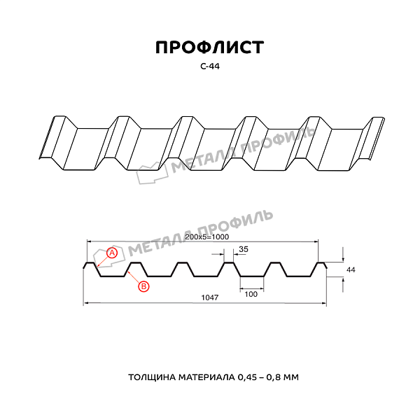 Профлист МЕТАЛЛ ПРОФИЛЬ С-44x1000-A (VikingMP-01-3005-0,45) — популярный материал для оформления профилированного листа. Представляет собой лист оцинкованной стали с покрытием. Толщина стальной основы с оцинковкой и декоративно-защитным покрытием составляет 0.45 мм. Проходя процедуру холодного проката, металл принимает волнообразный вид. Жёсткость профилированного листа на порядок выше плоского.